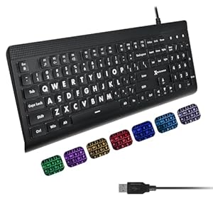 X9 Large Print Backlit Computer Keyboard – Easy to See Big Letters – Lighted USB Wired Keyboard with 7-Colors Backlight, Full Size Oversized Light Up Keyboard for Windows, PC, Laptop – Plug and PlayTYPE WITH EASE AND CONFIDENCE – Featuring large, bold print, this large font key board makes every character easy to see. A great solution for seniors, students, and visually impaired users who want a more comfortable computer keyboard experience.