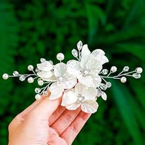 Bridal Flower Side Comb Wedding White Ceramic Floral Crystal Pearl Silver Hollow-out Leaf Small Hair Piece Accessories for Women【Material】 The white flower bridal hair piece is made of quality alloy wire, ceramic flowers, faux pearls, clear rhinestone and metal leaf, elegant and delicate, easy to wear and not easy to fade
