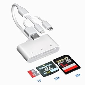 Triple Ports & Triple Slots for Full Compatibility: Featuring Lightning, USB-C, and USB-A ports, this SD card reader works seamlessly with iPhones, iPads, computers, and Android devices. The three dedicated card slots (SD/TF/XD) support SD, SDHC, SDXC, MicroSD, MicroSDHC, MicroSDXC, and XD Picture Cards—making it a versatile all-in-one solution.
