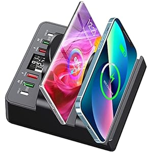 Wireless Charging Station with 6 USB Ports, 8 in 1 15W Dual Wireless Charger Station, 2 QC/2 PD USB Fast Charging Station, 80W Phone Charger for iPhone14/13/12/11/X/Samsung/Android/iWatch⚡【8 in 1 Wireless Charging Station with USB Ports】The wireless charging Station adopts a dual 15 w wireless charger + 2 QC ports + 2 PD ports + 2 USB ports combination, it can charge mobile phones, Bluetooth headsets, game consoles, smart bracelets, iPads, MP3s, and other USB devices, support up to 8 devices. By charging through a single multi-port USB charger station, you reduced the number of USB wall chargers required and freed up outlets in your home and office.