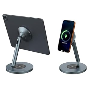 Nillkin Magnetic iPad Stand for Desk, MagSafe Wireless iPhone Charger Stand, 360° Rotating Base, Adjustable Aluminum Tablet Holder for Work, Office, Home, Kitchen Use2-in-1 Stand: Attach the included magnetic ring to the back of your tablet to transform it into a magnetic stand compatible with all tablets; it also functions as a MagSafe wireless charging phone stand, providing fast charging for your iPhone devices. This versatile magnetic iPad stand offers a brand-new multi-device experience.