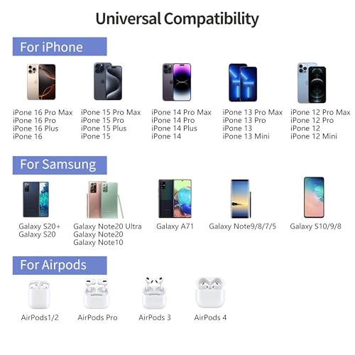 【Universal Compatibility】- Our Wireless charger is universally compatible with all wireless phones. For iphone series such as iphone 16/16 Plus/16 Pro/16 Pro Max/15/15 Plus/15 Pro/15 Pro Max/14/14 Plus/14 Pro/14 Pro Max/13/13 Pro/13 Pro max/12/12 Pro/12 Pro max/12 mini/SE/11/11 pro/11 Pro max/X/Xs/Xs Max/8/8 Plus. For Samsung phones such as Galaxy S22/S21/S20/S10/9/8/7 seris, Note20 Ultra/Note20/Note10/9/8/7/5. And other wireless phones and headphones (Can not charge watch)