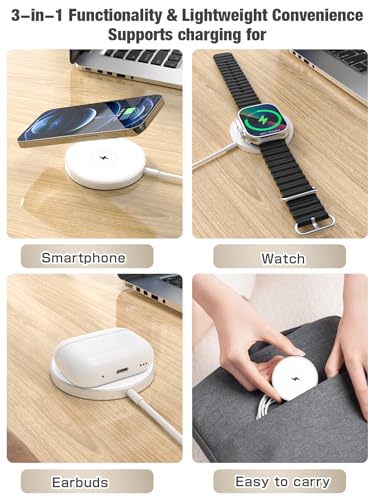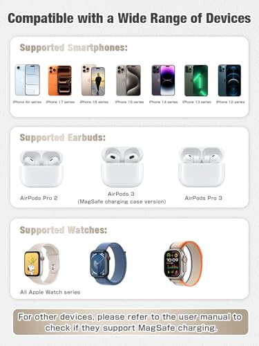 【Universal Compatibility | iPhone 12-17, All Apple Watches & AirPods】 Works seamlessly with your entire Apple ecosystem! Specifically designed for iPhone 17,16, 15, 14, 13, 12 series (including Pro, Pro Max, Plus, and mini models), all generations of Apple Watch (Series 2-9, SE, Ultra), and AirPods Pro 3/2/1, AirPods 3 & 4 (with magnetic or Qi-enabled case). Even non-magnetic Qi devices can charge using a magnetic ring adapter (not included). It’s the only charger your Apple family will ever need.