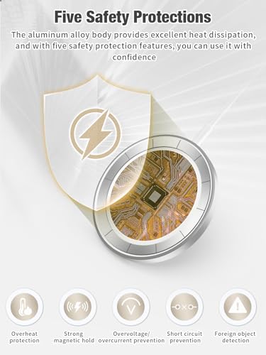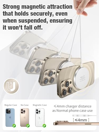 【Sleek, Portable & Case-Friendly Design】 Crafted for life on the go. Measuring just 55mm in diameter and weighing about 47g, this ultra-slim and lightweight charger is incredibly portable. Its minimalist design slips effortlessly into your bag for travel. The strong magnetic connection works through most cases under 4mm thick—no need to remove your favorite protective case every time you charge. Premium materials offer a secure grip and a sleek, scratch-resistant surface.