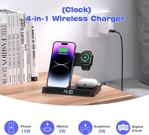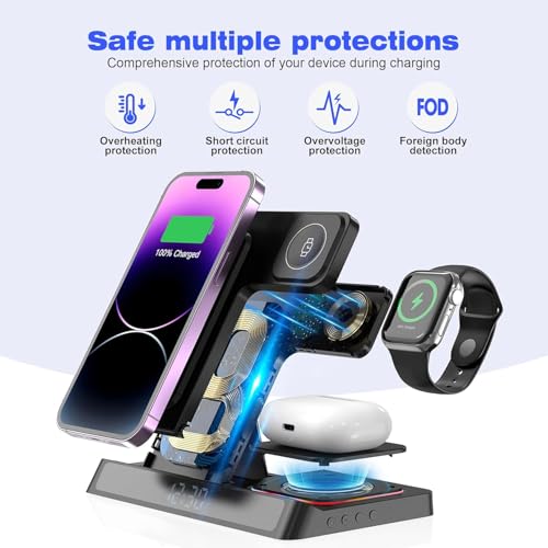 Wireless Charger: When used with the included 18W QC 3.0 adapter, our 4-in-1 charger delivers up to 5-15W of charging power for iPhone and other smartphones, depending on what your device model is. Available for AirPods Up to 3W charging power, providing up to 3W charging power for Apple Watch. Safety charger, this charger has multiple protection functions to prevent overheating, overcharging and short circuit, ensuring safe and reliable charging of your valuable devices.
