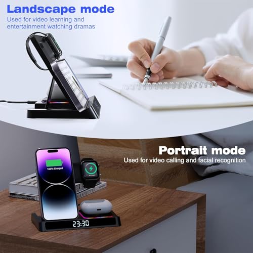 Multifunctional 4-in-1 wireless charger: Compatible with iPhone AppleWatch Airpods Pro Samsung Galaxy, Compatible with all Qi-enabled device, and TWS Bluetooth headset charging. The design of the night light is also very special and practical. It can charge multiple devices at the same time. Place your device in the charging area to charge wirelessly. You can place the phone vertically or horizontally without affecting the charging of the phone.
