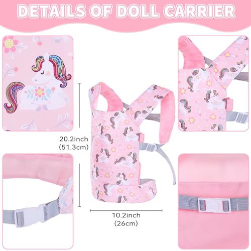Adjustable Doll Carrier: There is a front buckle on the doll carrier. Allowing for easy adjustment depending on the size of the doll being carried. The Doll Carrier adjustable straps on the shoulders, chest, and waist to fit children of different ages, heights and weights.