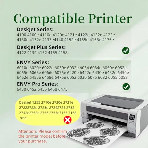 Printer Compatible ink cartridge: (1)HP DeskJet 4100 Series: 4110e, 4120e, 4121e, 4122e, 4123e, 4130e, 4132e, 4152e, 4155e, 4158e; DeskJet Plus 4122, 4132, 4155 (2)ENVY 6000 Series: 6010e, 6020e, 6022e, 6030e, 6032e, 6034e, 6050e, 6052e, 6055, 6055e, 6075, 6075e( 3)ENVY 6400 Series:6420e, 6422e, 6430e, 6432e, 6450e, 6452e, 6455e, 6458e, 6475e; ENVY Pro 6455, 6458, 6475