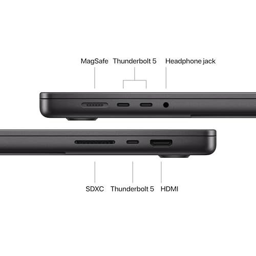 CONNECT IT ALL — This MacBook Pro features three Thunderbolt 5 ports and a MagSafe 3 charging port, SDXC card slot, HDMI port, and headphone jack. And it supports up to two external displays with M4 Pro, or up to four with M4 Max.