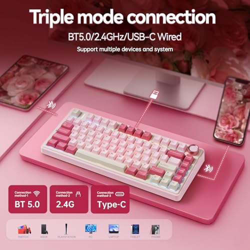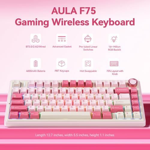 AULA F75 Wireless Keyboard, 75% Gaming Keyboard Hot Swappable with Creamy Sound,Bluetooth/2.4GHz/USB-C,Custom RGB Mechanical Keyboard for PC Gamer – Pink