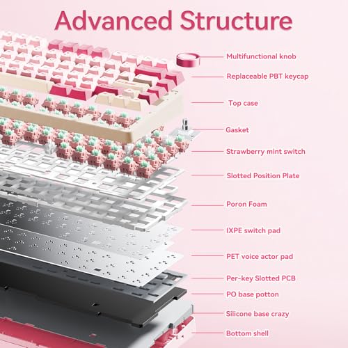 Gasket structure & PBT Manga Keycaps: This creamy keyboard features gakets structure with 5 sound and shock-absorbing layers, effectively counteracting the cavity noise sound of the shaft hitting the positioning plate, each keystroke delivers creamy tactile feedback and a signature creamy sound loved by enthusiasts,Takes durability to the next level with its Cherry-profile double-shot PBT manga keycaps, ensuring a perfect blend of robustness and stylish design