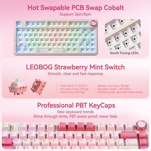 Hot-Swap Custom Keyboard: F75 gaming keyboards equipped with pre-lubricated stabilizers and LEOBOG reaper switches, brings you smooth typing feeling and pleasant creamy sound, and provides fast response for exciting game. With hot-swappable base(supports 3-pin or 5-pin switches) , you can easily DIY your own keyboards without soldering issue