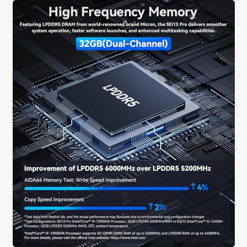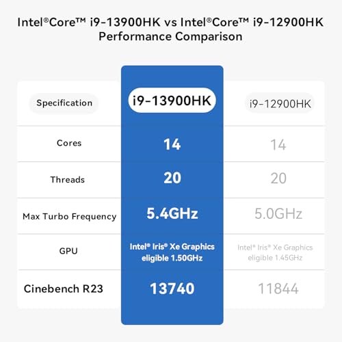 🔥Intel Core i9 13900HK CPU- The latest Beelink SEi13 Pro Mini computer is powered by 13th Gen Core i9-13900HK, has 14 cores/20 threads, 24M Cache L3, basic 2.5GHz, running up to 5.4GHz at 65W TDP, greatly improved efficiency and performance. Upgraded performance more than 20% better than Core i9 12900HK, Ryzen 7 8745HS . Perfect for home working, business offices, servers use.