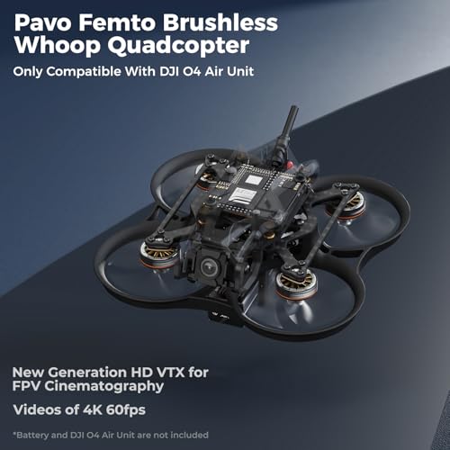 2S 4K Pocket Drone: BETAFPV Pavo Femto is a 2S high-definition brushless drone tailored for the DJI O4 Air Unit, delivering exceptional 4K/60fps video recording and unparalleled 2S 4K flight performance in a compact design. With customizable settings and robust components, the Pavo Femto excels in both freestyle flying and aerial videography (Comes without DJI O4 Air Unit by default)