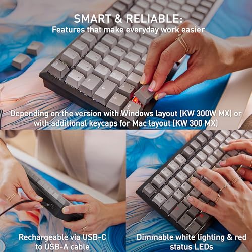 Compact dimensions, a sound-proofed housing for quiet operation, white, dimmable lighting and of course our original, German-made CHERRY MX2A switches. The CHERRY KW 300 MX has it all. The wireless hot-swap keyboard also has a useful dial for controlling various functions and a hot-swap base for replacing individual switches. The rechargeable keyboard can be connected via Bluetooth or using a standard cable. The keyboard is great for Mac users too: The CHERRY KW 300 MX comes with additional keycaps that you can use to easily convert the keyboard from a Windows layout to a Mac layout. If you only use Windows, the mechanical keyboard is also available without the additional keycaps as the CHERRY KW 300W MX.