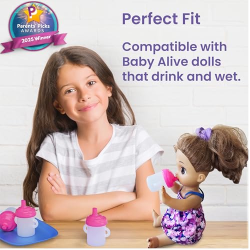 🧸 COMPATIBLE WITH BABY ALIVE DOLLS: Our doll sippy cups are compatible with Baby Alive Dolls that “drink” and “wet”, including the popular Baby Alive Magical Mixer Doll. All dolls sold separately.