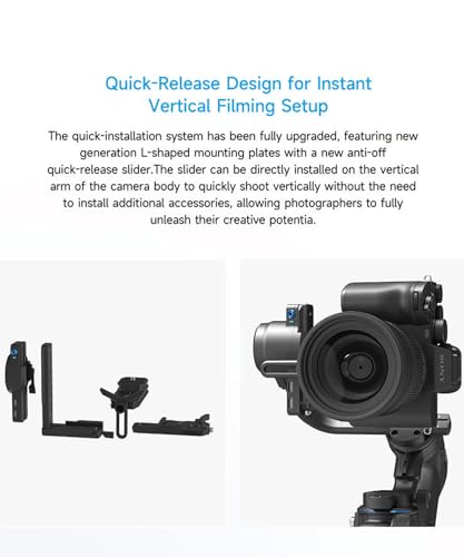 [Quick-release design for instant vertical filming setup]: The quick-installation system has been fully upgraded, featuring newgeneration L-shaped mounting plates with a new anti-off quick-release slider. The slider can be directly installed on the vertical arm of the camera body to quickly shoot vertically without the need to install additional accessories, allowing photographers to fully unleash their creative potential.