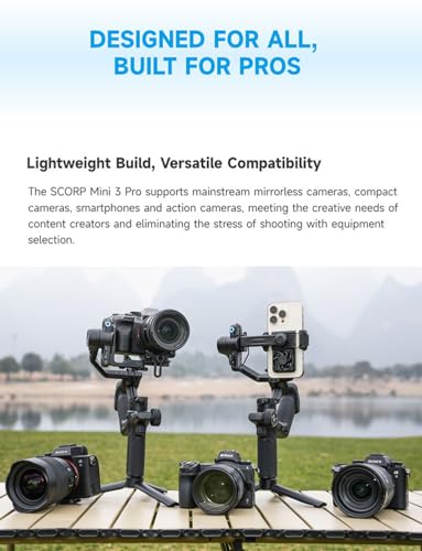 Four-in-one Design: Lightweight Build, Versatile Compatibility: FeiyuTech SCORP Mini 3 Pro supports mainstream mirrorless cameras, compact cameras, smartphones and action cameras, meeting the creative needs of content creators and eliminating the stress of shooting with equipment selection