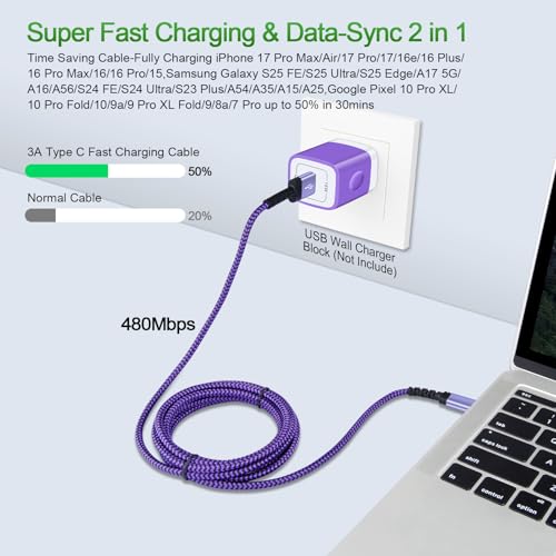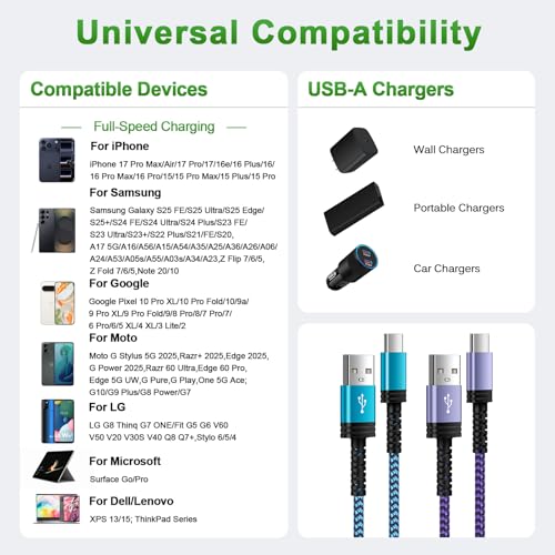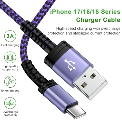 【Compatibility】USB to USB C Fast Charging Cable for iPhone 17 Pro Max,Air,17 Pro,17,16e,16,16 Pro Max,16 Plus,16 Pro,15,15 Plus,15 Pro Max;Samsung Galaxy S25 Ultra,S25 Edge,S25 FE,S24 FE,S24 Ultra,A17 5G,A16,A36,A25,A56,A35,A54,A15,A14,S23 FE,S22 Plus,A13,A53,A03s,A23,Z Fold7 6 5,Z Flip7 6 5,A24,S21,S20,Note 20/10+;Google Pixel 10 Pro XL/Fold,10,9a,9 Pro XL/Fold,9,8a,8 Pro,7,7 Pro,6a,6,5 XL,4a,3;Moto G Stylus 5G 2025,Razr+ 2025,Razr 60 Ultra,Edge 2025,G Power 2025,G Pure,G Play,G10/G9 Plus.