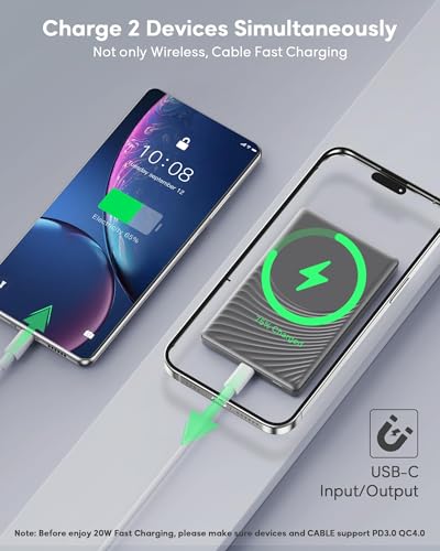 📡Wireless and Wired Fast Charging – Power Bank for Mag-safe can charge your iPhone to 55% in 30 minutes via Wireless Charging, especially for iPhone 17/16/15/14/13/12 series, which is 3.5X faster than original phone chargers.It common if it might be get hot while charging, just like the original one. We kept the USB-C outport in case you wanna 20W Fast Charging which charge iPhone to 70% in 30 minutes, also it could avoid getting hot by USB-C cable