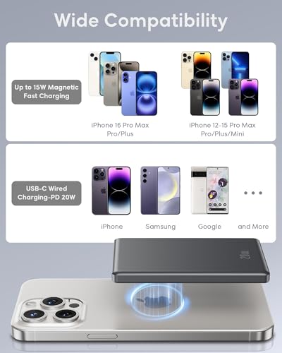 🧲Strong Magnetic Power bank – This wireless battery pack adopts 2025’s advanced and innovative magnetic suction technology, with a magnetic force of up to 10N, which can be firmly attached to the phone. Thanks to its thin and light, you can charge your phone while using it with one hand. You can hardly even feel it. It’s really great! [Note: Powerbank Magnetic charging function is ONLY compatible with Mag-safe case on iPhone 16/15/14/13/12 series, USB C fast charging for Samsung Xiaomi,etc]