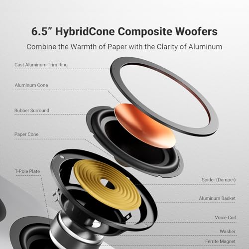 Deep & Textured Bass: The 6.5″ in-house developed HybridCone woofers combine paper cones with aluminum alloy outer layers, balancing the natural, relaxed tonality of paper with the precision and control of metal, resulting in deeper, more textured bass