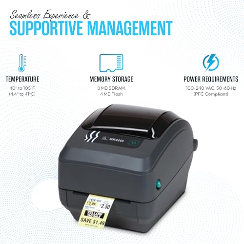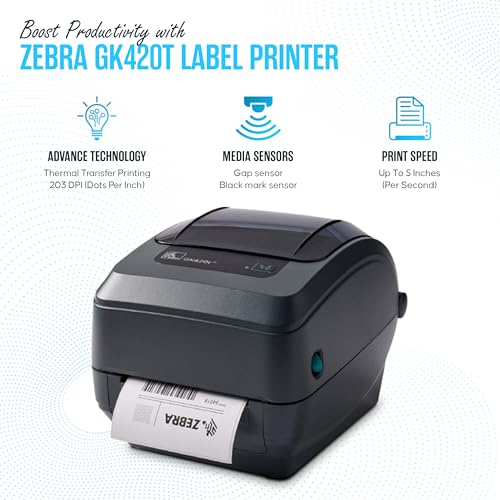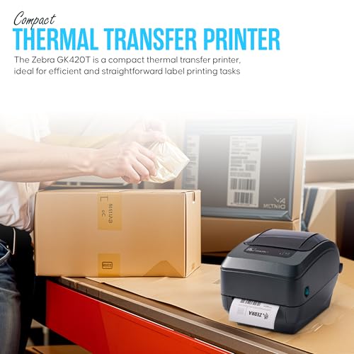 GK420T Zebra Thermal Transfer Monochrome Desktop Printer for Labels, Receipts, Barcodes, Tags, and Wrist Bands – with USB, Ethernet Port Connectivity & Microfiber Cleaning Cloth