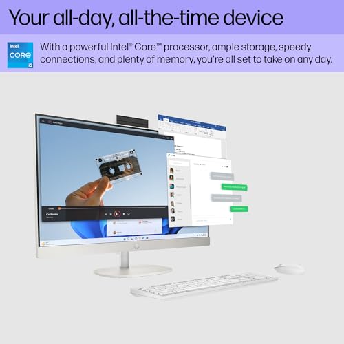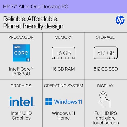 The HP 27 inch All-in-One Desktop takes caring for the planet to the next level. This contemporary, ultra-slim desktop was designed with the planet in mind, while turning your to-do lists into to-done lists with the reliable processing power of the Intel Core i5-1335U, upgraded memory, and enhanced multitasking features for heightened performance. Plus, this HP desktop is EPEAT Gold registered and ENERGY STAR certified. This HP computer comes with an HP white wireless keyboard, HP white wireless mouse, 90 W Smart AC power adapter, and setup instructions. HP is here to help. This HP computer comes with 1-year limited hardware warranty and 90-days limited technical support for software and initial setup.