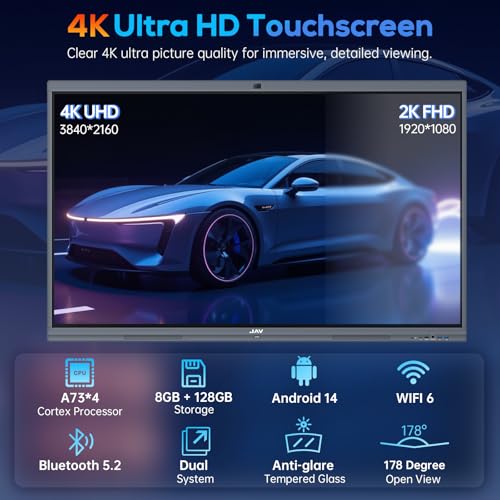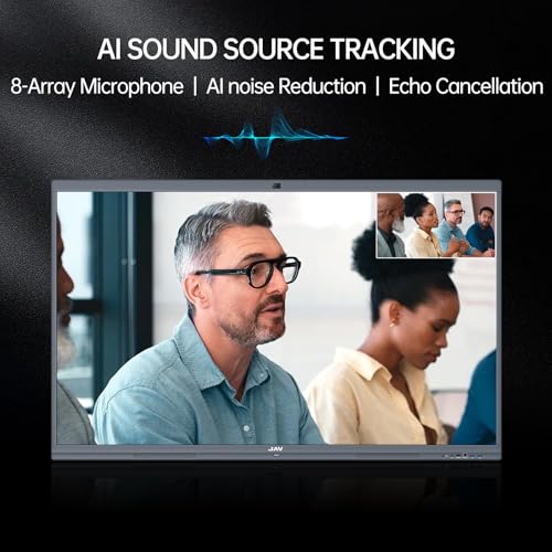 This JAV smart board bundle includes a 4K anti-glare touch screen with Android 14, 8GB RAM, 128GB storage, a 48MP AI camera, 8 microphones, and dual 16W speakers. Paired with a sleek motorized stand for 47″–65″ screens, it’s perfect for classrooms, meetings, and hybrid workspaces.