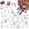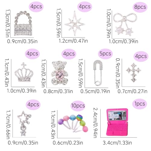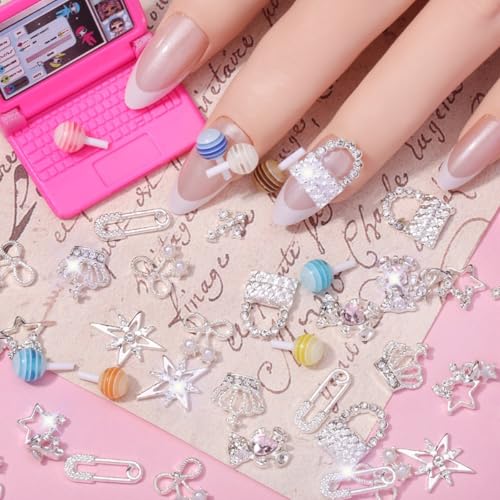 48PCS Y2K NAIL CHARMS (11 STYLES) – Includes silver alloy rhinestone charms (bags, bears, bows, crowns, hearts, stars) + resin lollipops & computers for endless nail art creativity