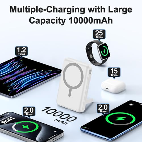 Magnetic Portable Charger, 10000mAh Wireless Power Bank for iPhone with Built-in Cables, 20W Fast Charging for Magsafe Battery Pack with Stand for iPhone Air/17/16/15/14/13/12 and Apple Watch