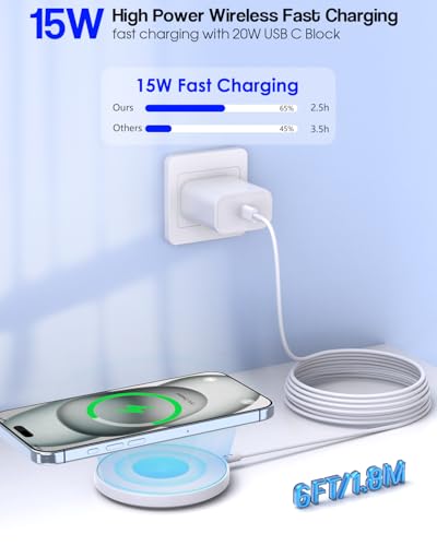 [15W Fast Magnetic Wireless Charging Pad] 15W fast wireless charging pad with 20W power USB C block provides a fast,safe and charging experience,2X faster than standard 5W charging.The apple wireless charger with magnetic design ensures a stable and strong fit without sliding or falling off, firmly holds your iPhone while charging, it won’t sliding or falling off easily, making charging more convenient and reassuring
