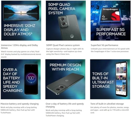 Full immersion: Every stunning detail comes to life on a notchless 6.6″ display. Super-smooth motion: Go easy on your eyes with a 120Hz refresh rate. The 5G boost you need: Experience next-level 5G performance and go further without breaking a sweat4. Brilliant results with every pic: From breathtaking landscapes to detailed close-ups, the advanced 50MP camera system captures every moment in vivid detail. Stay connected all day – Work and play non-stop: Free yourself from power concerns with a massive 5000mAh battery that provides over a day of battery life. Get hours of power in no time with blazing-fast TurboPower charging. Attainable opulence: Stand out with a sleek design crafted from high-quality materials like vegan leather, without the premium price. Stay safe from accidental spills and splashes with a water-repellent design.