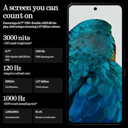 Display: The Nothing Phone (3a) Pro boasts a 6.77-inch 120Hz AMOLED flexible LTPS display with a resolution of 1080 x 2392 (387 ppi), a 20:9 aspect ratio, and a peak brightness of 3000 nits, supporting HDR10+, 1.07 billion colors, 10-bit color depth, DCI-P3 100% color gamut, and a 1,000,000:1 contrast ratio, with a 2160Hz PWM frequency and an 87.80% screen-to-body ratio.