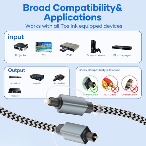 Universal Device Compatibility: This optical cable for soundbars and home theaters seamlessly connects to a wide range of devices with a standard Toslink (S/PDIF,Optical) port,making it easy to connect your devices such as TVs,soundbars,speakers,receivers,PS4s,Xboxes,Blu-ray players,and more.This cable is ideal for anyone who wants to upgrade their audio setup with a fiber optic cable,which is perfectly compatible with a wide range of devices.