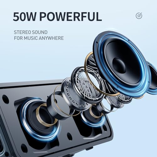 IMMERSIVE SOUND EXPERIENCE: This Bluetooth speaker has 50W high-definition sound and powerful bass, subwoofer and dual passive bass radiators, which can produce super strong bass. Advanced tweeters can produce high-definition sound. This loud Bluetooth speaker also provides stereo surround sound, and emits balanced mid, crisp highs and deep bass with almost no distortion, allowing you to enjoy music.