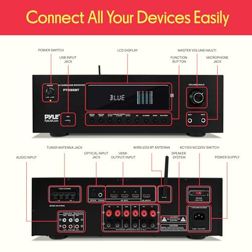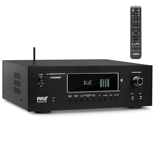 Features: – 5.2 Channel Receiver System – AV (Audio/Video) Stereo Amplifier – Hi-Fi Home Theater Surround Sound – Built-in Bluetooth Wireless Audio Streaming – Next-Gen Audio DSP Sound Processing Technology – 4K Ultra HD TV Pass-Through Support – 3D Video & Blu-Ray Video Pass-Through Support – Digital Dynamic, VFD Display with AM/FM Radio – Connect & Stream Audio from External Devices – MP3 Digital Audio Support – USB Flash Drive Reader – Connection Interface: (2) IN, (1) OUT x HD, Speaker Binding Posts, Optical / COAX Digital Audio – HDMI Output + Dedicated RCA Subwoofer Output – (2) 1/4’’ -inch Microphone Inputs – Independent Input Source Selection – Digital Graphic Audio Output Level Display – Mic Echo, Bass, Treble, Volume Control Adjustment – Over Current, Short Circuit, and Over Voltage Protection Wireless Bluetooth Connectivity: – Simple & Hassle-Free Pairing – Instantly Receives Wireless Music Streaming – Works with all of Today’s Latest Devices – Smartphones, Tablets, Laptops, Computers, etc.) – Bluetooth Version: 5.0 – Bluetooth Network Name: ‘PYLE PRO’ – Wireless Range: 30’+ ft. What’s in the Box: – AV Receiver – Remote Control – Power Cable Technical Specs: – Power Output: 1000 Watt MAX – Amplifier Receiver Type: 5.2-Channel – Speaker Impedance: 4-16 Ohm – S/N Ratio: >80dB – T.H.D.: <0.05% – Frequency Response: 20Hz-20kHz – Radio Station Memory: 30 Presets – Digital Audio File Support: MP3 / WMA / APE / FLAC – Maximum USB Flash Support: Up to 1 TB – Battery Operated Remote Control, Requires (2) x ‘AAA’ Batteries, Not Included – Power Cable Length: 3.9’ ft. – Power Supply: 120V/240V, switchable – Total Unit Dimensions (L x W x H): 16.9’’ x 13.8’’ x 5.5 ’’ -inches.
