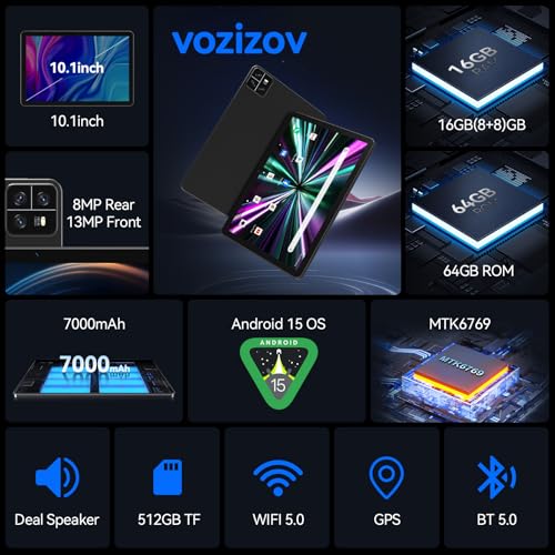 Tablet, 10.1 inch Android 15 Tablets With Octa-Core, 16GB RAM + 64GB ROM 512GB TF Tablets Support GMS, 7000 mAh Battery Tablet 1280×800 Resolution, GPS, 8+13MP, 5G WIFI+2.4G WIFI, BT5.0&Deal Speaker