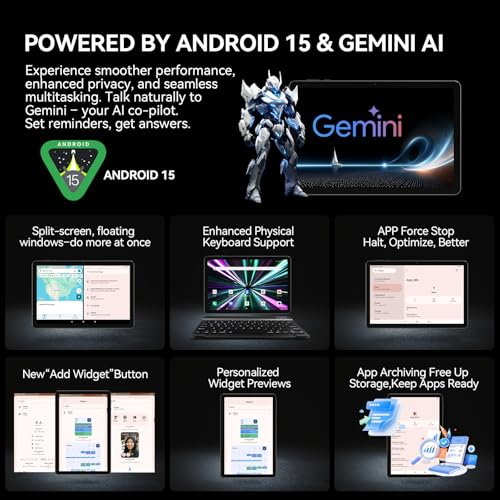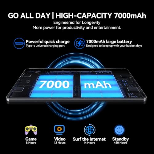 [7000mAh Long-Lasting Battery, Rapid Recharge] This Android 15 tablet built with a large 7000mAh battery, offers impressive endurance, allowing for hours of uninterrupted movie streaming, online Browse, video calls, or work tasks – say goodbye to battery anxiety. The Type-C port supports fast charging for quick power-ups, minimizing downtime. The advanced power management features of Android 15 further optimize battery efficiency, extending battery life while maintaining high performance.