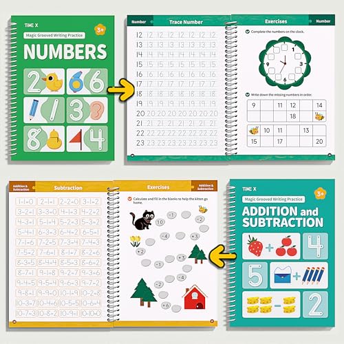 Designed for 4-8 Years Old – Magic groove writing practice books are perfect for preschoolers to practice writing, helping children build a solid writing foundation. Includes 6 Magic Groove Writing Practice Copybooks (Numbers, Addition/Subtraction, Letters, Phrases, and Drawing*2), 2 Pen Holding Aids, 1 Pen, and 5 Refills – everything your child needs to start learning