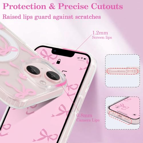 UEEBAI Magnetic for iPhone 15 Case, Bow Case Compatible with MagSafe, Wireless Slim Clear Ribbon Aesthetic Phone Cover Anti-Yellowing Shockproof Protective Cover for Women Girl – Pink