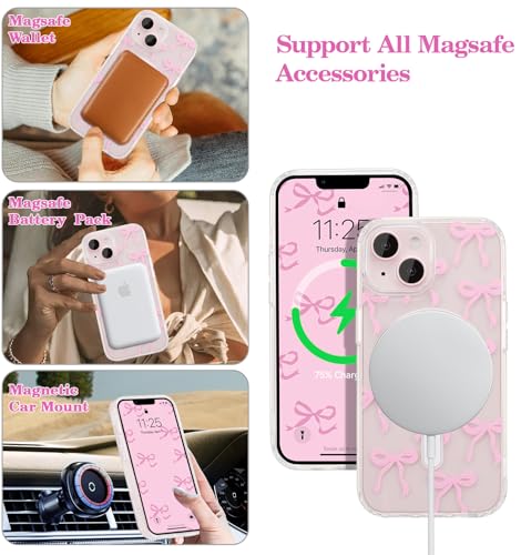 UEEBAI Magnetic for iPhone 15 Case, Bow Case Compatible with MagSafe, Wireless Slim Clear Ribbon Aesthetic Phone Cover Anti-Yellowing Shockproof Protective Cover for Women Girl - Pink