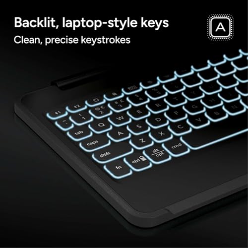 The detachable backlit keyboard features individually lit keys with adjustable brightness, ensuring comfortable typing in any lighting condition. When you need tablet-only functionality, the keyboard easily detaches via magnetic connection. The innovative hinged design allows multiple viewing angles from typing position to presentation mode, with strong magnets keeping your iPad secure yet easily adjustable.